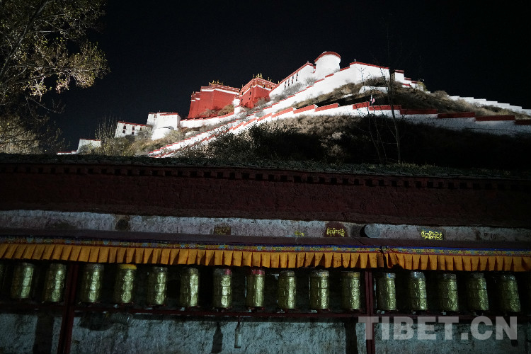 圖為布達拉宮廣場東側(cè)湖面處的夜景