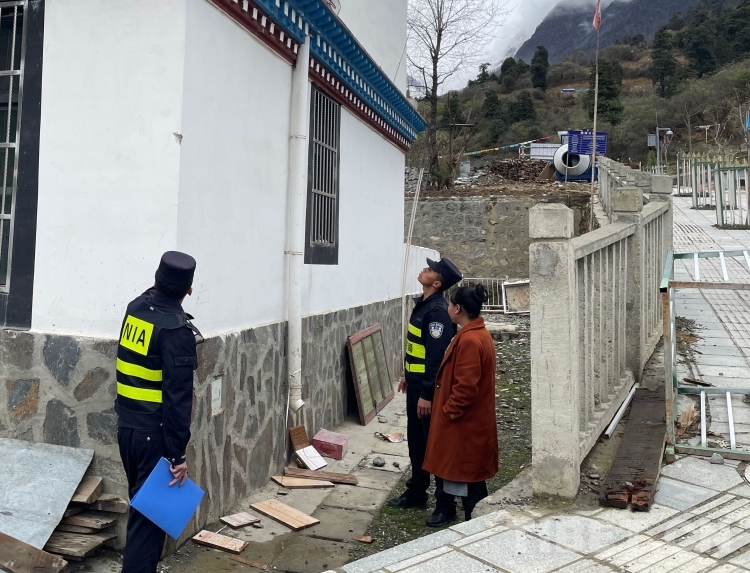 圖為西藏山南邊境管理支隊(duì)隆子扎日邊境派出所民警對(duì)邊民群眾住宅進(jìn)行震后排查