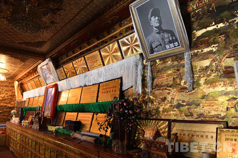 圖為寺廟懸掛著西藏自治區(qū)級(jí)、市級(jí)、縣級(jí)和諧模范寺廟、愛國愛教寺廟等榮譽(yù)獎(jiǎng)牌,以及前西藏軍區(qū)司令員、十八軍軍長張國華的照片 攝影:索南多杰