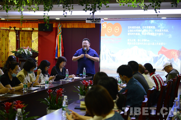 圖為“同心·共鑄中國心”組委會項目辦公室主任薛艷斌行前介紹果洛州具體情況
