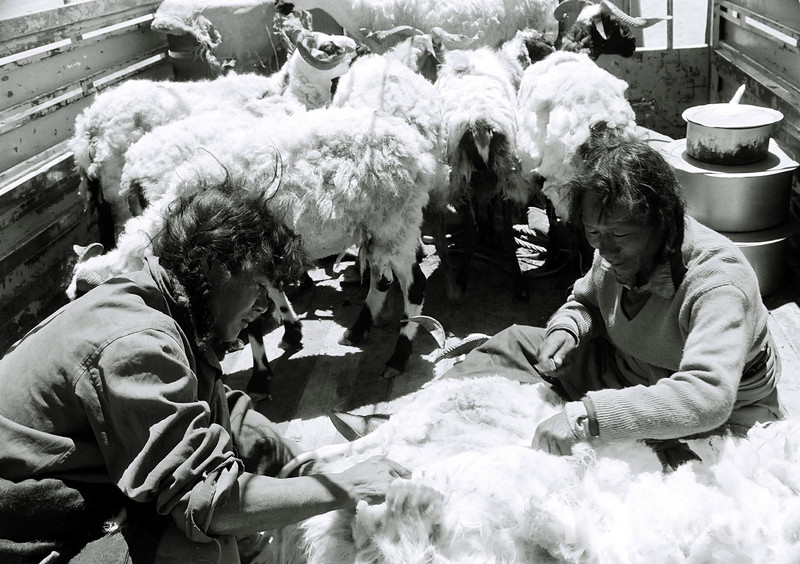 40歲上下的索仁正在那里“剪”羊毛,準(zhǔn)確地應(yīng)該說是在那里割羊毛。他手中握著一把帶柄的刀,兩個膝蓋壓住躺在地上的綿羊,10多歲的兒子抓著羊角,刀看起來很鋒利,只見一團(tuán)團(tuán)羊毛不斷地從羊身上滑落下來,十幾分鐘一只羊就被他“剪”完了毛,據(jù)說“割毛”并不比剪毛慢。藏北西部乃至西藏至今還有不少牧民沿用這種古老的“剪”毛方法。他的妻子和兩個女兒則把割下的羊毛擰成繩打成捆。