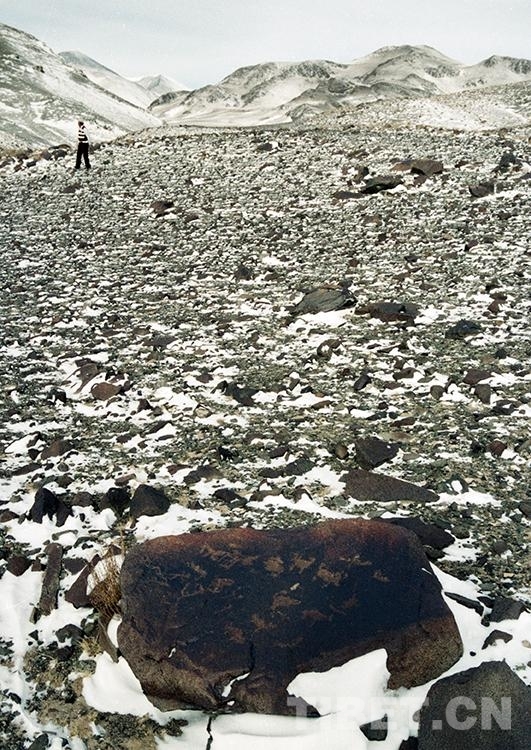這是藏北無人區(qū)科考團科考人員在對尼瑪縣榮瑪鄉(xiāng)加林山巖畫進行科學考察(唐召明2001年攝)
