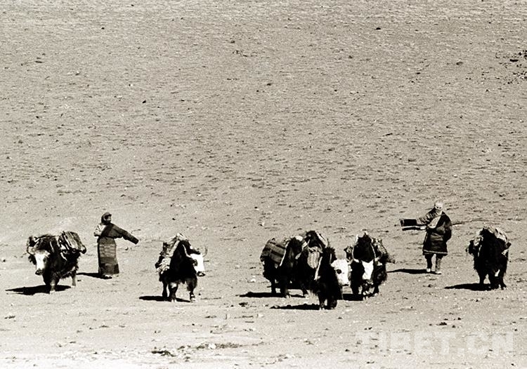 這是逐水草而居,趕著馱物牦牛正在轉(zhuǎn)移草場的雙湖辦事處(現(xiàn)雙湖縣)牧民人家(唐召明1987年攝)