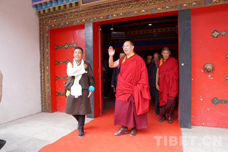 紀(jì)念館外,聞?dòng)嵍鴣?lái)的信教群眾手捧哈達(dá),迎候班禪并恭?!霸鞯吕铡?。班禪在走進(jìn)紀(jì)念館前后,揮手向群眾回以祝福。