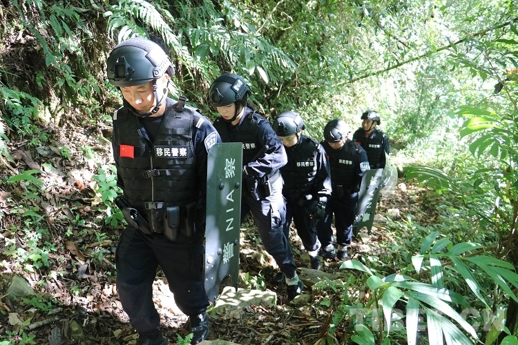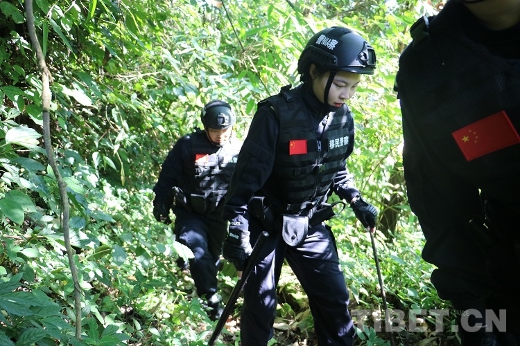 走在隊(duì)伍最前面的是經(jīng)驗(yàn)豐富的老民警李永杰,他手里拿著一把砍刀,一邊清理小路兩側(cè)蔓延出來的枝椏,一邊時(shí)刻注意著兩位女民警情況。隨著海拔升高,走進(jìn)樹木茂盛的叢林,陽光只能從郁郁蔥蔥的樹葉間撒下兩三縷光芒,兩名女民警瞪大眼睛好奇地觀察著周圍,對(duì)接下來的行程充滿期待。