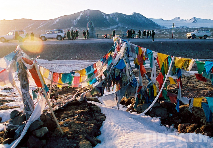 這是青藏公路所經(jīng)過(guò)的海拔為5231米的唐古拉山口,現(xiàn)已成為游人的觀(guān)光之地(唐召明1996年攝)