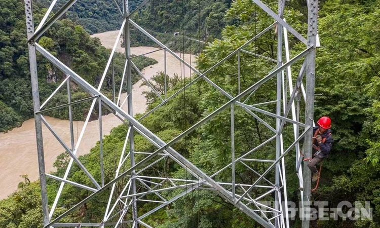 圖為工人正在鐵塔上進(jìn)行施工作業(yè),腳下是湍急的帕隆藏布江 攝影:趙耀