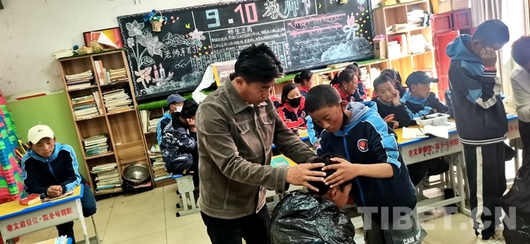 圖為薩迦縣中學理發(fā)社學生在老師指導下給其他學生剪頭發(fā)