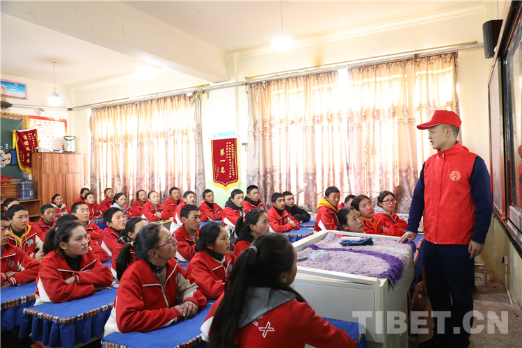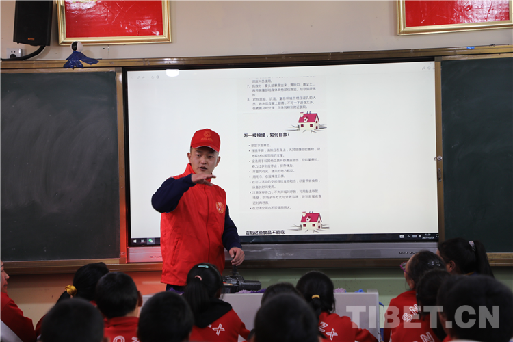 圖為那曲市森林消防大隊(duì)志愿者來(lái)到駐地附屬中學(xué)為師生們講解地震自救相關(guān)常識(shí)