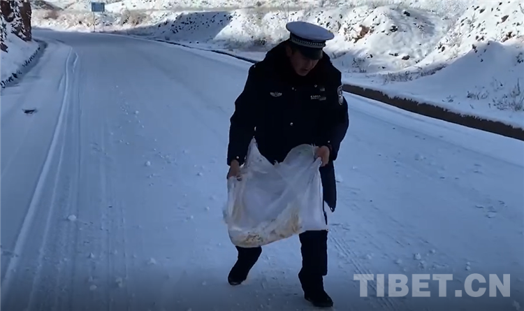 2018年3月,國道317突然遭遇了暴雪天氣,許多群眾和車輛被困在了矮拉山山頂,扎西四郎跟著隊(duì)友們在零下三十多度的惡劣環(huán)境下堅(jiān)守了28天。令扎西四郎印象最深刻的是有一次,因?yàn)檐囎記]辦法通行,隊(duì)長指揮民警帶群眾下山。當(dāng)時(shí),有一位要去拉薩的老奶奶腿腳不方便,她自己根本就沒辦法走動(dòng),扎西四郎就和桑珠一起輪流背著老人下山,雖然中間滑倒了幾次,可還是把老人背到了能通車的安全位置,老人為了表達(dá)感激,還專門給他們留下了拉薩的住址和聯(lián)系電話。