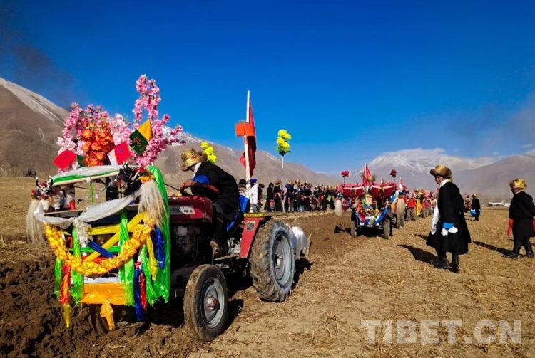 據(jù)悉,儀式當(dāng)日上午,村民們會身著節(jié)日盛裝,歡聚在田間地頭、載歌載舞隆重舉行春耕春播儀式。活動現(xiàn)場,姑娘們舉起手中的切瑪、青稞酒、人參果為犁手們唱歌敬酒,在祝福的歌聲中,開啟春耕“第一犁”。在西藏,過去是牦牛耕地,如今,隨著農(nóng)業(yè)科學(xué)化發(fā)展,現(xiàn)在農(nóng)耕都用現(xiàn)代化的拖拉機“鐵?!备?。一般吉時一到,一個個犁手頭頂金黃圓筒帽,身穿氆氌藏裝駕著一輛輛插著五星紅旗,系著潔白哈達的“鐵牛”緩緩駛進田間,一片片沃土隨著鐵犁慢慢翻開,婦女們在后面播撒青稞良種……在田埂上形成一道最靚麗的風(fēng)景線,好不壯觀!