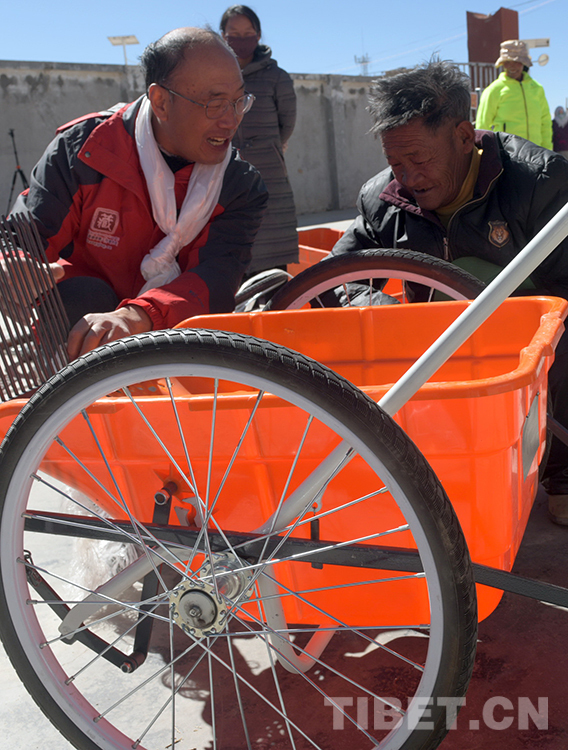 這是唐召明(左)在雙湖縣嘎措鄉(xiāng)一村指導他30多年前的房東、藏族牧民朋友日瑪(右)安裝北京建藏援藏工作者協(xié)會贈送的高原撿拾車(楊月云2019年9月20日攝)