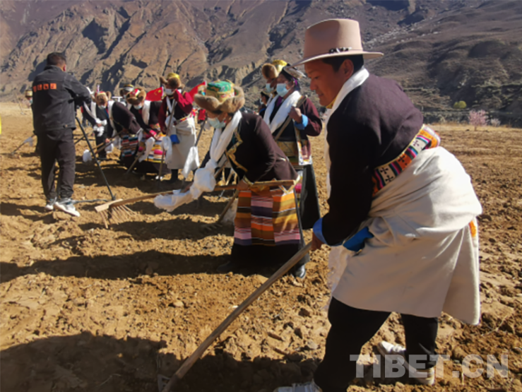 活動(dòng)現(xiàn)場(chǎng),群眾頭戴藏式金花帽,身著氆氌藏裝,或手持犁耙和鋤頭,或開(kāi)著拖拉機(jī),以吃切瑪、敬青稞酒、獻(xiàn)哈達(dá)、跳鍋莊、犁地、播種等傳統(tǒng)習(xí)俗,隆重慶祝共康村首屆開(kāi)耕節(jié)。