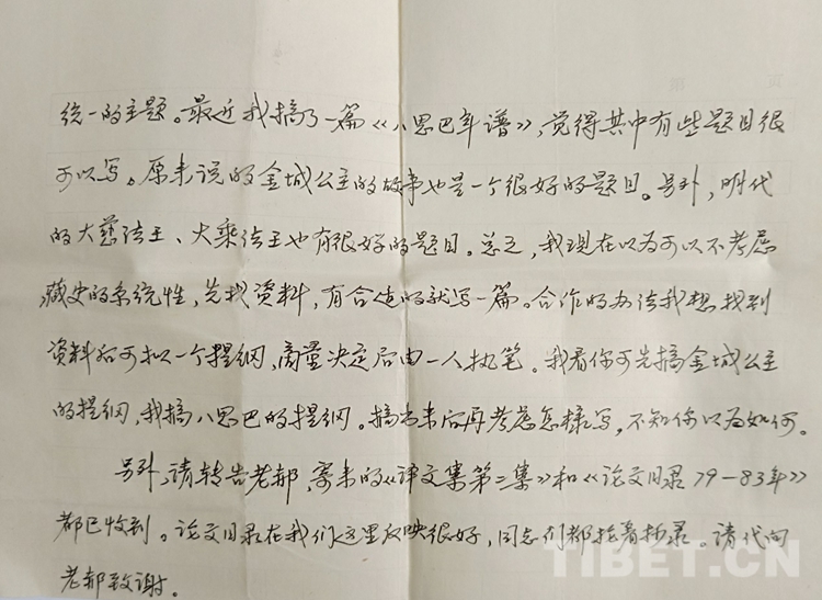 記得我大學畢業(yè)剛到新單位,人生地不熟,加之原來沉浸在“文學夢”中,現(xiàn)在陡然轉(zhuǎn)到藏族歷史研究,所謂基礎不牢地動山搖,困惑加不適,可想而知。陳老師在聊天中得知我的情況后,談到文史不分家,自己對文學也很有興趣,與青?!跺3薄肪庉嫼苁煜?。這樣,我遇到一個學識淵博的良師益友,聆聽指教,何其難得。在陳老師的鼓勵和幫助下,我在惶惑中嘗試把歷史與文學結合起來,與他合作發(fā)表了歷史故事新編《長安和親》《香波山奇遇—吐蕃聶墀贊普的故事》等,平穩(wěn)地完成了專業(yè)變動的過渡期。后來,他離開中央民族學院到青海社會科學院工作,我們之間仍堅持信件往來,得到他很多幫助。每一次通信,我們談得最多的都是學術。在某次回信中,他談及下一步合作的工作,特別提到“至于今后如何搞,我想原來定的歷史故事新編計劃似乎是太大了一點。主要從藏族史的系統(tǒng)性考慮,而沒有考慮到現(xiàn)實的需要。所以我想還是先寫主題符合現(xiàn)實需要的題目,寫歌頌民族團結、文化交流,國家統(tǒng)一的主題。最近,我搞了一篇《八思巴年譜》,覺得其中有些題目很可以寫。原來說的金城公主的故事也是一個很好的題目。另外,明代的大慈法王、大乘法王也有很好的題目??傊椰F(xiàn)在認為可以不考慮藏族史的系統(tǒng)性,先找資料,有合適的就寫一篇。合作的辦法我想找到資料后,可擬一個提綱,商量決定后,由一人執(zhí)筆。我看你可先搞金城公主的提綱,我搞八思巴的提綱,搞出來后再考慮怎樣寫,不知你以為如何?!?/p>
