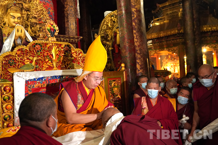 位于大殿東側(cè)正中的主殿,供奉有唐代文成公主帶入雪域高原的釋迦牟尼十二歲等身佛像。班禪入內(nèi),虔誠(chéng)而莊重地向佛像叩頭朝拜、敬獻(xiàn)哈達(dá)。隨后登上法座,在領(lǐng)經(jīng)師的伴誦下帶領(lǐng)眾僧誦經(jīng),祈愿國(guó)泰民安、世界和平、風(fēng)調(diào)雨順、人類遠(yuǎn)離疫情、消災(zāi)祛難。集體誦經(jīng)結(jié)束后,班禪為大昭寺眾僧摸頂賜福并發(fā)放布施。