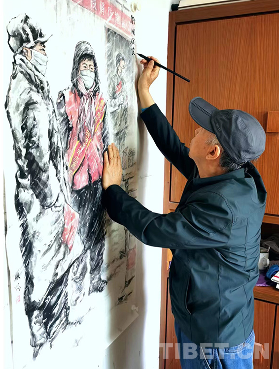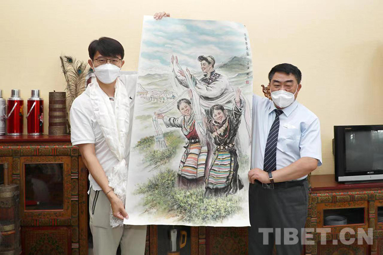 “我愛人看到了咱們館(西藏文化博物館)發(fā)的征稿啟事,然后就把這條信息發(fā)到家庭群里邊。過了不久,我父親說他畫了一張畫,讓我看看畫得怎么樣。我當時還很意外,本來想鼓勵我兒子畫一張,結(jié)果我兒子沒畫,老爺子畫得還很好。”6月21日,張兆林先生將自己的作品《哈達寄深情》捐贈給西藏文化博物館,張兆林之子張安誠將作品送至博物館并收到了捐贈證書。
