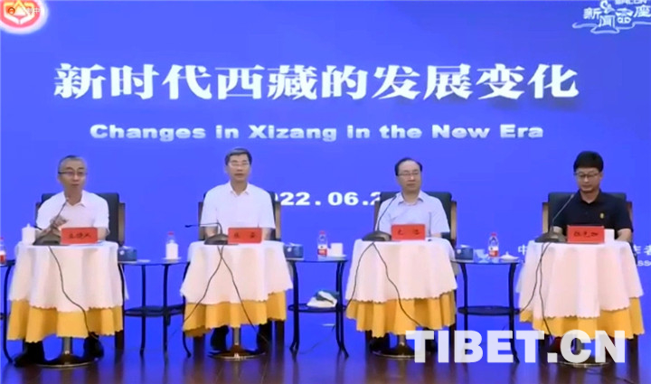 圖為6月22日,中國藏學(xué)研究中心二級研究員、學(xué)術(shù)委員會委員張?jiān)疲ㄗ蠖?,社會?jīng)濟(jì)研究所所長、研究員扎洛(左三),宗教研究所副所長、副研究員拉先加(右一)參加中國記協(xié)舉辦的“新時代西藏的發(fā)展變化”新聞茶座 截圖:劉莉