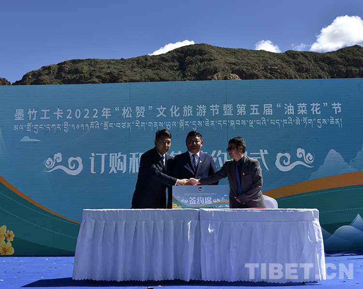在油菜花田中舉辦的開(kāi)幕式上,墨竹工卡縣農(nóng)牧業(yè)凈土產(chǎn)業(yè)發(fā)展有限公司代表與唐加鄉(xiāng)、扎西崗鄉(xiāng)分別簽訂認(rèn)購(gòu)、預(yù)售合同。在豐收時(shí)節(jié),該公司將以高出市場(chǎng)的價(jià)格訂單式收購(gòu)當(dāng)?shù)剞r(nóng)戶(hù)種植的油菜,預(yù)計(jì)收購(gòu)4000噸油菜籽。