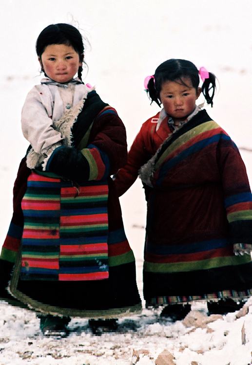 那是1989年歲末最后幾天,我隨藏北那曲地區(qū)(現那曲市)基層政權建設工作現場會“訪問團”來到文部辦事處(現尼瑪縣)參觀。來到卓瓦鄉(xiāng)時,我眼前突然一亮:在雪地上玩耍的草原小姐妹,三五歲的樣子,身著五彩羔皮藏袍,扎著羊角小辮,臉頰上印刻著深紫色“高原紅”。那是草原上一道最美麗的風景線,我不由得按動手中相機快門……