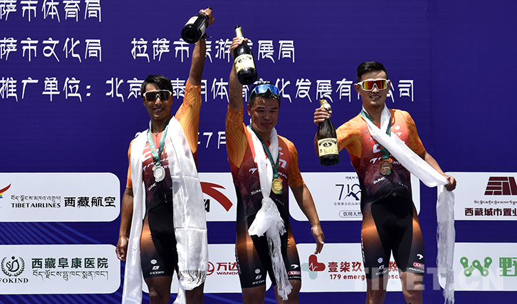 圖為7月23日,2022環(huán)拉薩城自行車(chē)大賽公路自行車(chē)男子精英組前三名侯棟乙(中)、胡志超(左)、孫小龍(右)在頒獎(jiǎng)儀式上慶祝 攝影:王媛媛