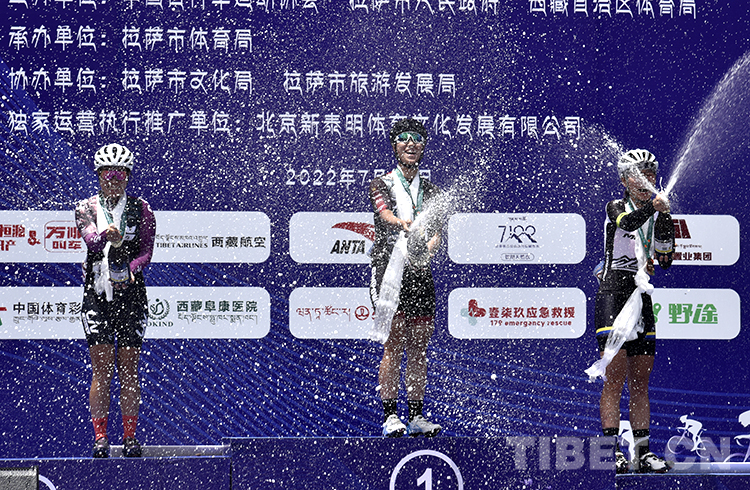 圖為7月23日,2022環(huán)拉薩城自行車(chē)大賽山地自行車(chē)女子公開(kāi)組前三名高艷嬌(中)、何艷(左)、宋寒冰(右)在頒獎(jiǎng)儀式上開(kāi)香檳慶祝 攝影:王媛媛