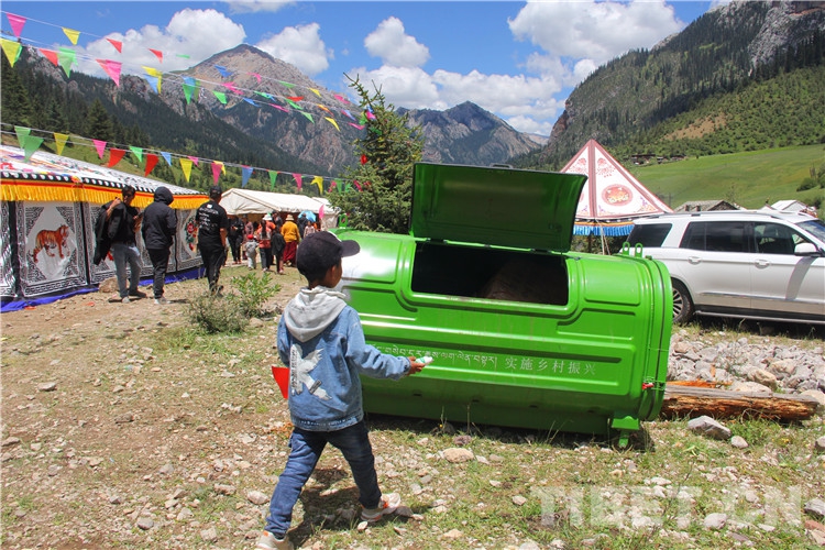 圖為2022年伊日鄉(xiāng)第二屆文化旅游藝術(shù)節(jié)上,小朋友將手中的飲料瓶扔進垃圾箱 攝影:王茜