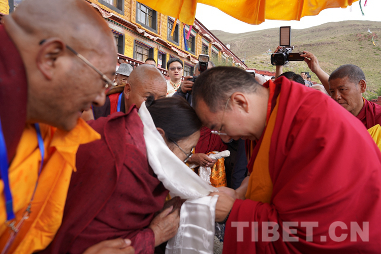 現(xiàn)年80歲高齡的桑頂?多吉帕姆德慶曲珍活佛在僧人的攙扶下前來迎接,班禪見到桑頂多吉帕姆活佛疾步向前,與桑頂多吉帕姆活佛互獻哈達,行碰頭禮,互致問候。