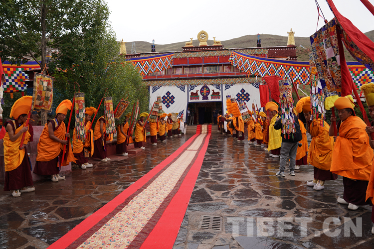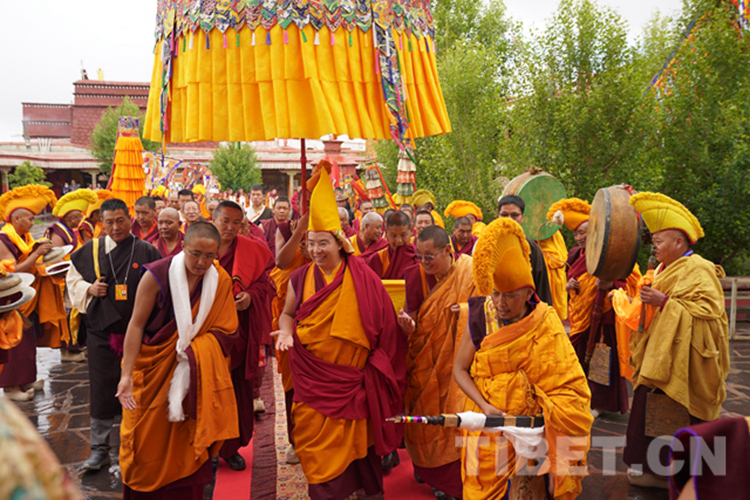 隨后,班禪在桑頂寺僧人和儀仗隊引領下緩緩入寺,依次朝拜銀塔菩提殿、密宗殿、強巴佛殿、次久拉康后至寺廟學經(jīng)院禮佛講經(jīng)。
