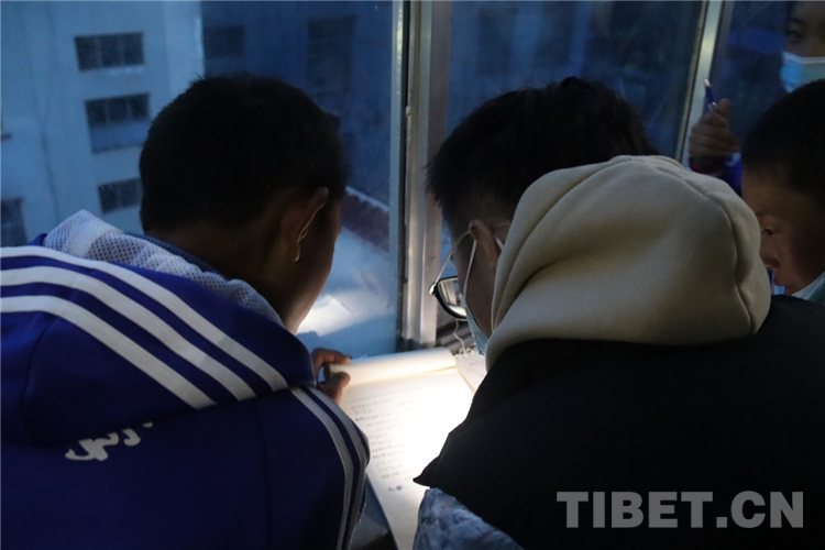 圖為支教團(tuán)成員晚上在樓梯間為孩子們答疑輔導(dǎo) 何其睿 攝