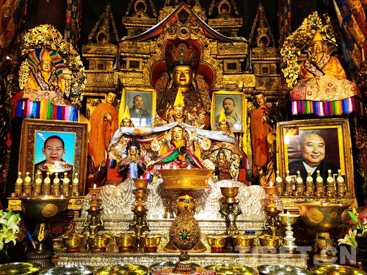 在措欽大殿,班禪虔誠叩拜供奉于此的佛祖釋迦牟尼佛像和藏傳佛教格魯派始祖宗喀巴塑像,與眾僧共同念誦經(jīng)文后,回到寢宮拉讓殿。下午,班禪登上拉讓日光殿寶座,接受扎什倫布寺管委會僧人成員、高僧朝拜,并為他們摸頂賜福,帶領(lǐng)高僧誦經(jīng)祈福。