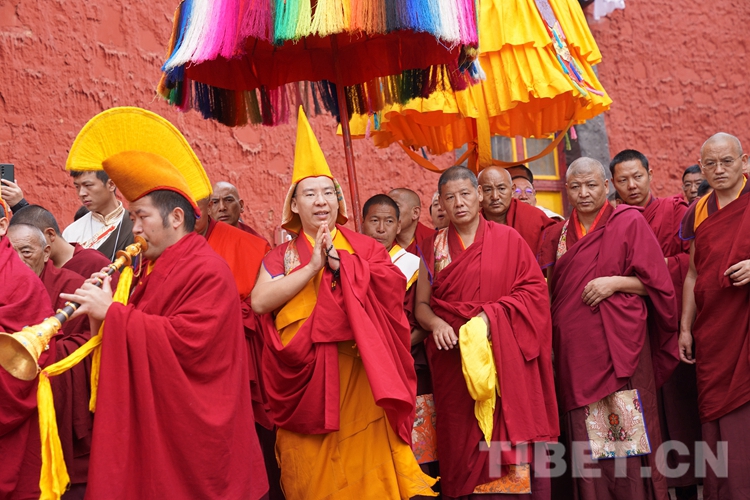 班禪抵達,現(xiàn)場桑煙繚繞,法號聲悠長,扎什倫布寺僧眾以藏傳佛教最高禮儀迎接班禪?,F(xiàn)場等候班禪的信教群眾紛紛摘帽行禮或雙手合十,向班禪的到來表示熱烈歡迎,班禪見狀揮手致意、送上祝福。隨后,班禪在手持黃傘、香爐的高僧引領(lǐng)下緩緩步行至措欽大殿。
