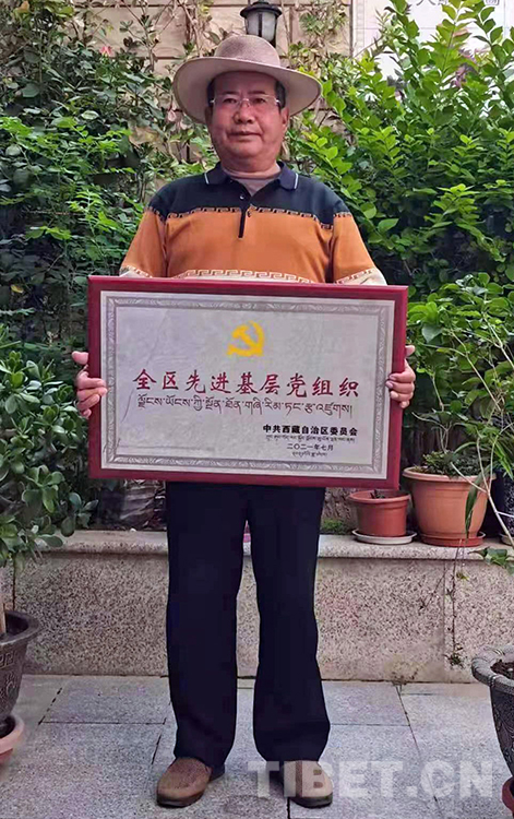 這是現(xiàn)任那曲駐拉薩第十退休黨支部書記加央多吉,手捧2021年所榮獲的中共西藏自治區(qū)委員會頒發(fā)的”全區(qū)先進(jìn)基層黨組織“獎牌拍照留念(唐召明提供,2021年7月份攝)