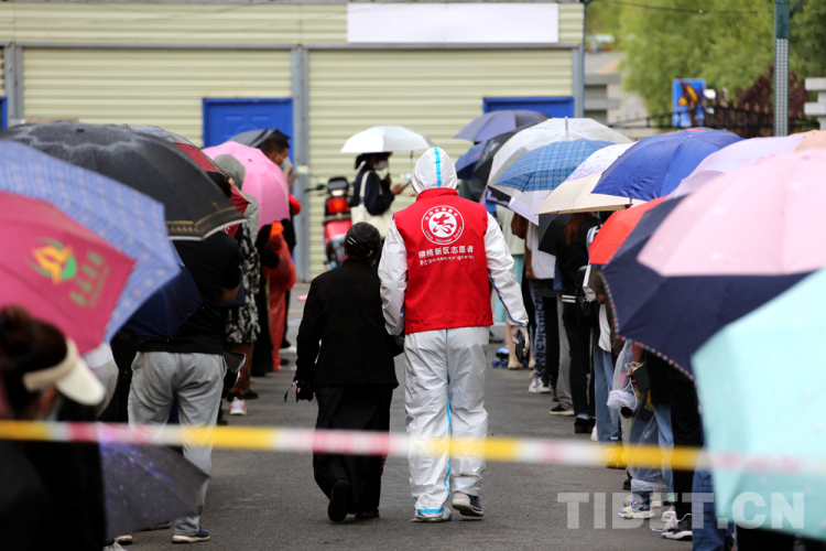 圖為拉薩市某核酸檢測(cè)點(diǎn)內(nèi)志愿者幫助行動(dòng)不便的老人完成核酸檢測(cè) 攝影:王佳豪