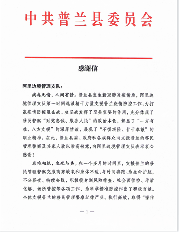 中國(guó)西藏網(wǎng)訊 “普蘭縣發(fā)生新冠肺炎疫情后,阿里邊境管理支隊(duì)第一時(shí)間選派精干力量支援普蘭疫情防控工作,為打贏疫情防控阻擊戰(zhàn)、攻堅(jiān)戰(zhàn)發(fā)揮了至關(guān)重要的作用?!?0月2日,西藏自治區(qū)阿里邊境管理支隊(duì)收到一封來自阿里地區(qū)普蘭縣委的感謝信。信中對(duì)阿里邊境管理支隊(duì)?wèi)?zhàn)“疫”一線民警在一個(gè)多月的疫情防控工作中,克服困難、勇于擔(dān)當(dāng)、不分晝夜、持續(xù)奮戰(zhàn)的抗疫工作表達(dá)了感謝,給予了肯定。