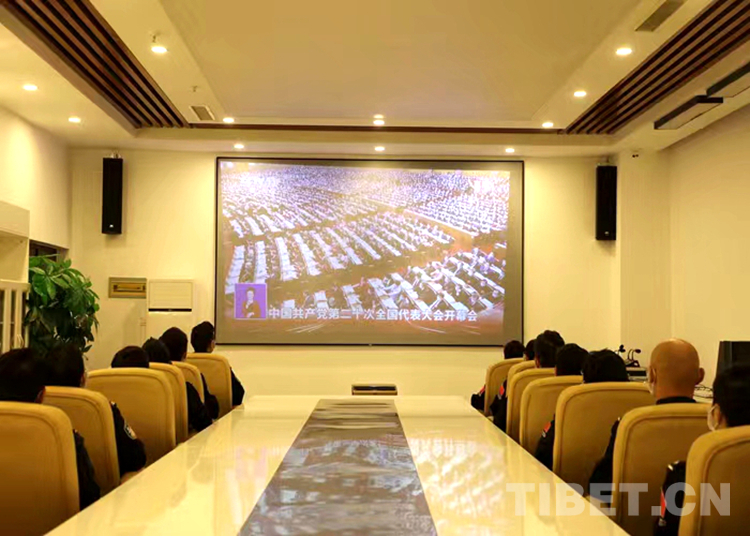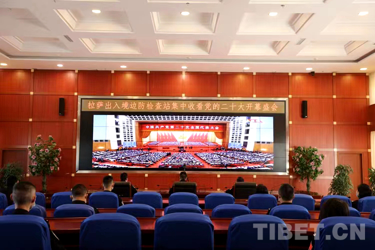 圖為拉薩出入境邊防檢查站機(jī)關(guān)民警在指揮中心會議室組織觀看黨的二十大開幕會盛況直播