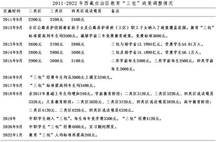黨的十八大以來,“三包(包吃、包住、包學費)”人均標準不斷大幅提升。2012年起,西藏全面落實15年公費教育“三包”政策。同年底,西藏“三包”年總經(jīng)費由2008年的3.61億元增加到12.29億元,年均增幅達36%,受惠學生增加到51萬人。 到2014年,西藏“三包”經(jīng)費增加到15.19億元,全區(qū)有52.5萬名學生受益,覆蓋面100%,實現(xiàn)了由“選擇性保障”到“覆蓋式保障”。 中央第六次西藏工作座談會后,投入力度更大。1985-2015年30年間,西藏“三包”經(jīng)費累計投入逾80億元, 而到2020年35年投入超200億元。僅2016-2020年,西藏教育“三包”資金投入達104.74億元,年均增幅11.4%。 從1985年到2020年的35年間,西藏教育“三包”政策累計調(diào)整20次,2011-2020年的10年間,就調(diào)整了10次。2022年1月,“三包”人均標準再次提高。在比如縣,2021年底全縣享受“三包”及助學金的學生達到17771人, 占比如縣總?cè)丝诘?4.5%。