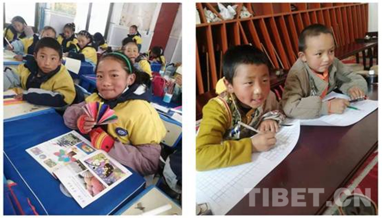 圖為西藏自治區(qū)那曲市比如縣羊秀鄉(xiāng)小學的孩子們在上手工課(左)和書法課(右) 攝影:米瑪旺久