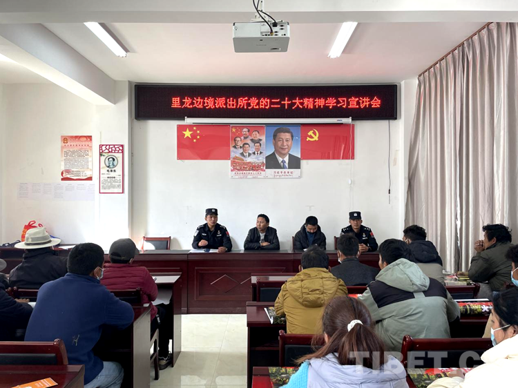 在林芝邊境管理支隊(duì)里龍邊境派出所玉松村的黨群活動(dòng)中心,民警們宣講著黨的二十大報(bào)告精神熱點(diǎn),普布老人和群眾們聽(tīng)著黨的“好聲音”臉上露出了燦爛的笑容。
