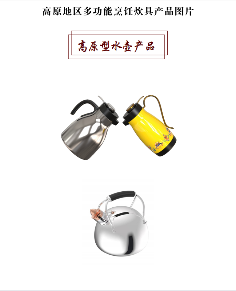 西藏自治區(qū)海拔跨度大,人民群眾生活范圍主要在800米至5000米左右,針對不同海拔高度需要不同烹飪壓力及不同烹飪時間的需求,研發(fā)的高原地區(qū)多功能烹飪炊具可實現(xiàn)一鍵調壓、多檔控壓和感溫定時功能。新研發(fā)的壓力鍋針對不同的海拔地區(qū)可以實現(xiàn)不同的壓力控制,從而在不同的沸點均能快速煮熟食物,實現(xiàn)與區(qū)外煮熟時間相同,且兼具口感,并保留食物更多的營養(yǎng)成分。新研發(fā)的高原地區(qū)專用燒水壺(明火款、電子款)也實現(xiàn)了在不同海拔地區(qū)均能與區(qū)外相同時間使壺內水沸騰后達到100℃,從而保障高原地區(qū)廣大群眾都能喝上燒開的水。