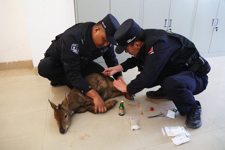 圖為聶拉木邊檢站民警在處理野生動物的傷口 攝影:尼瑪?shù)┰?/p>