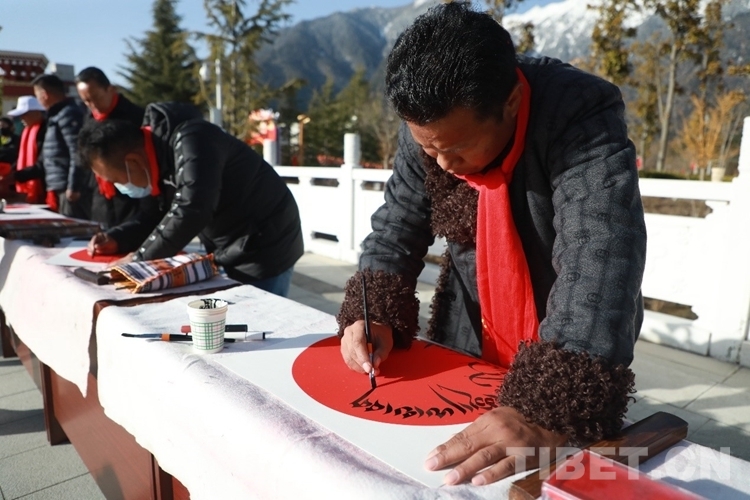 在林芝市藏醫(yī)院工作的巴桑次仁,是林芝市文聯(lián)書法家協(xié)會會員。當天一大早,林芝市文聯(lián)書法家協(xié)會的各位書法家揮毫潑墨,不停地為群眾寫下新年祈福和愿望。現(xiàn)場群眾簇擁觀摩,與書法家們認真交流,臉上不時揚起幸福的笑容。據(jù)悉,活動當天,書法家協(xié)會共送出100余副春聯(lián)、150余幅字畫。