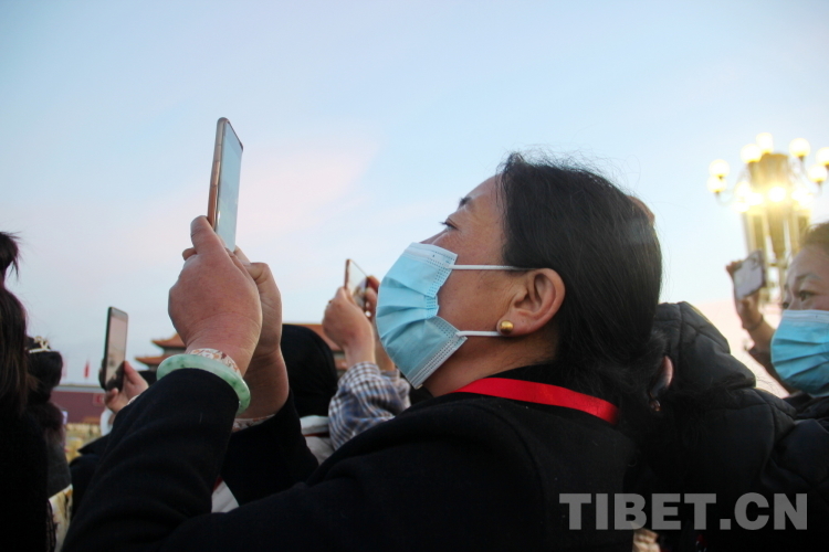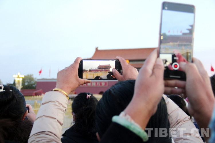 圖為“2023年西藏基層婦聯(lián)干部赴京學(xué)習(xí)參觀團”成員們紛紛用手機記錄下國旗護衛(wèi)隊行進(jìn)的英姿 攝影:陳浩力