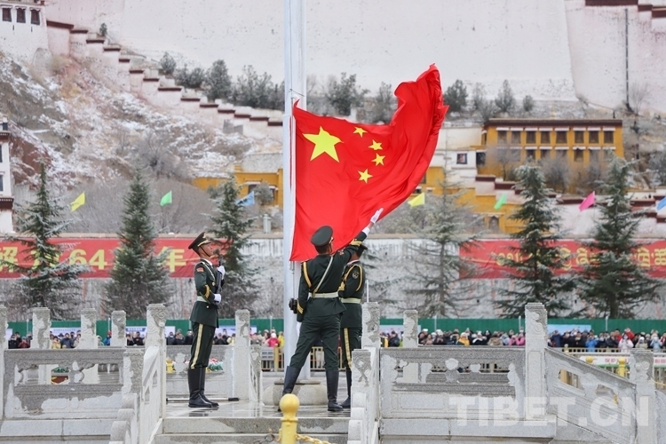 28日清晨,瑞雪洗禮拉薩,處處煥然一新,在干凈清新的氣息中,來自西藏各族各界的代表2000余人齊聚布達(dá)拉宮廣場(chǎng),以升國(guó)旗、唱國(guó)歌的方式紀(jì)念百萬農(nóng)奴解放64周年。