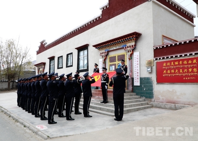 圖為山南邊境管理支隊(duì)機(jī)關(guān)黨員民警在乃東區(qū)結(jié)巴鄉(xiāng)朗生互助組展廳旁重溫入黨誓詞 攝影:鄭琦山
