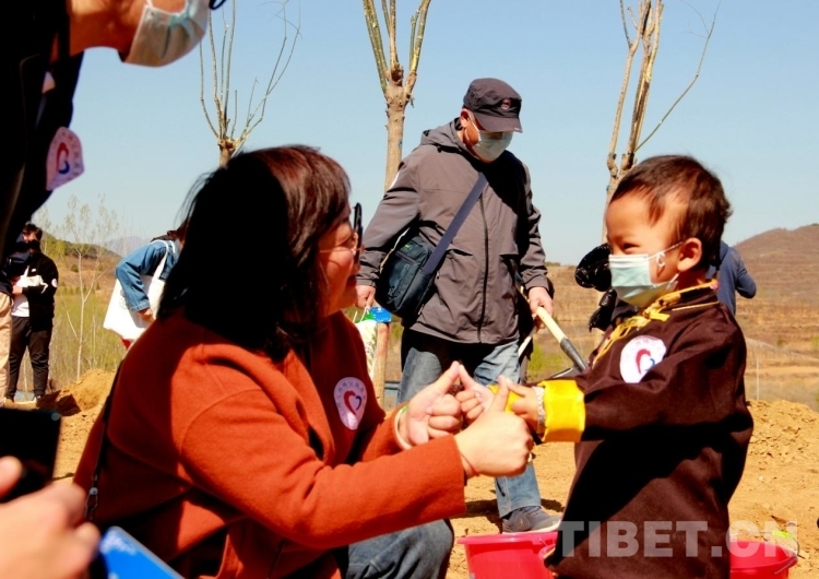 來(lái)自青海省果洛藏族自治州的多杰雖然才3歲多,但在掌握了鐵锨的使用后,他就成了整個(gè)植樹(shù)區(qū)域的熱心人,到處幫助別人鏟土,樂(lè)此不疲。圖為多杰正在幫助別人鏟土植樹(shù) 攝影:劉莉