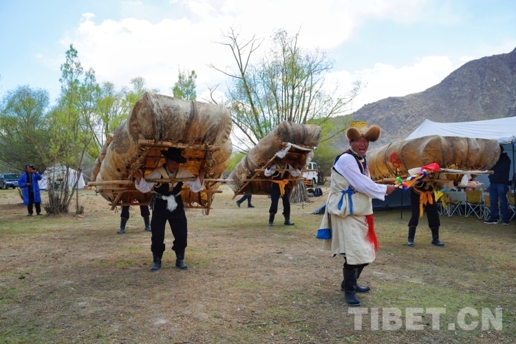 當(dāng)天恰好是周六,從拉薩來體驗的游客不在少數(shù),有的是觀看了抖音直播就馬上騎車過來體驗的。在營地,大家欣賞到了當(dāng)?shù)氐摹肮挝琛保ㄅFご瑁?,廓孜由邊唱邊跳的“阿熱”和身背牛皮船跳舞的“船夫”合作表演。“阿熱”是郭孜舞中的領(lǐng)舞者,跳牛皮船舞時,“阿熱”手執(zhí)“塔塔”(五彩旗桿),唱著歌,跳著舞,另外4位舞者看著“阿熱”的動作,背著重約80斤的牛皮船,用同樣的動作跟著“阿熱”跳舞。大家動作整齊,船漿擊打船舷的“咚咚”聲不絕于耳。