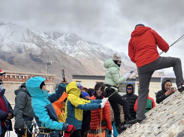 圖為登山隊(duì)專業(yè)教練對(duì)山友們進(jìn)行指導(dǎo) 攝影:德吉卓瑪