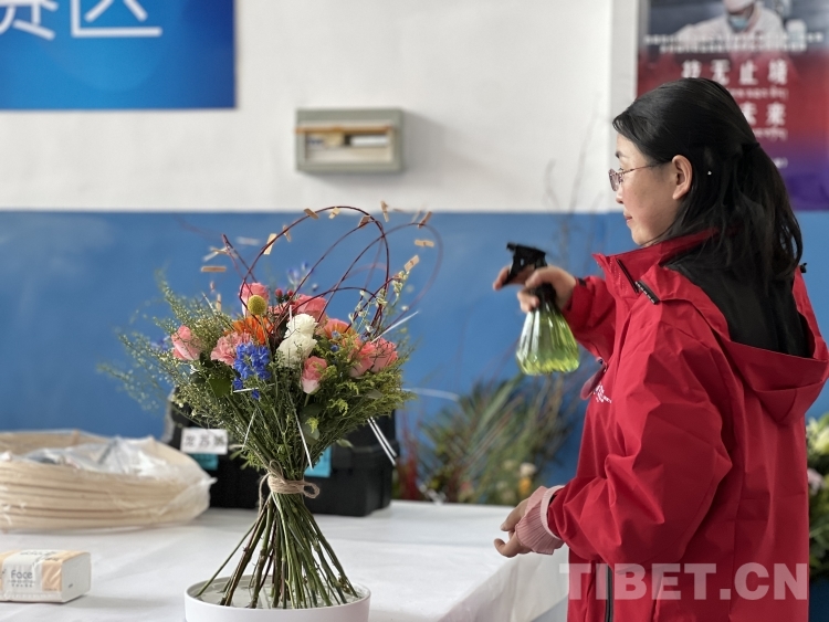 圖為林芝市職業(yè)技術(shù)學(xué)校職工組選手龍?zhí)K娟對自己的花藝作品進(jìn)行噴水保鮮 攝影:德吉卓瑪