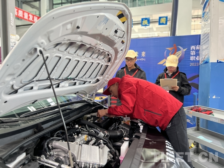 圖為參賽選手進(jìn)行汽車維修項目比賽 攝影:德吉卓瑪