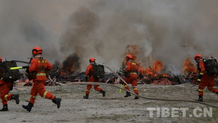 圖為林芝市森林消防支隊救援人員在“應急使命·西藏2023”抗震救災實戰(zhàn)化演習中撲打火線。